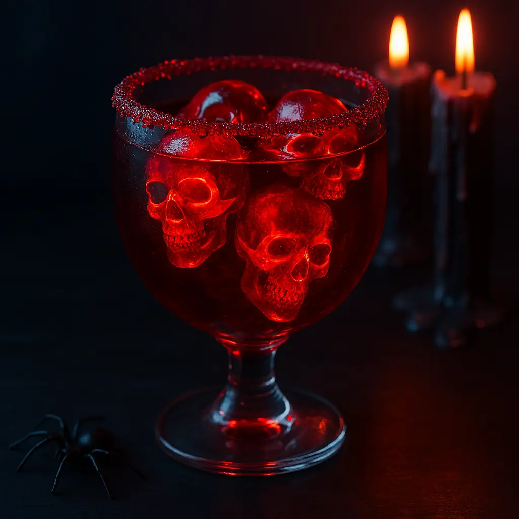 - Versez le cocktail dans les verres et ajoutez des glaçons en forme de crânes (utilisez des moules spécifiques).