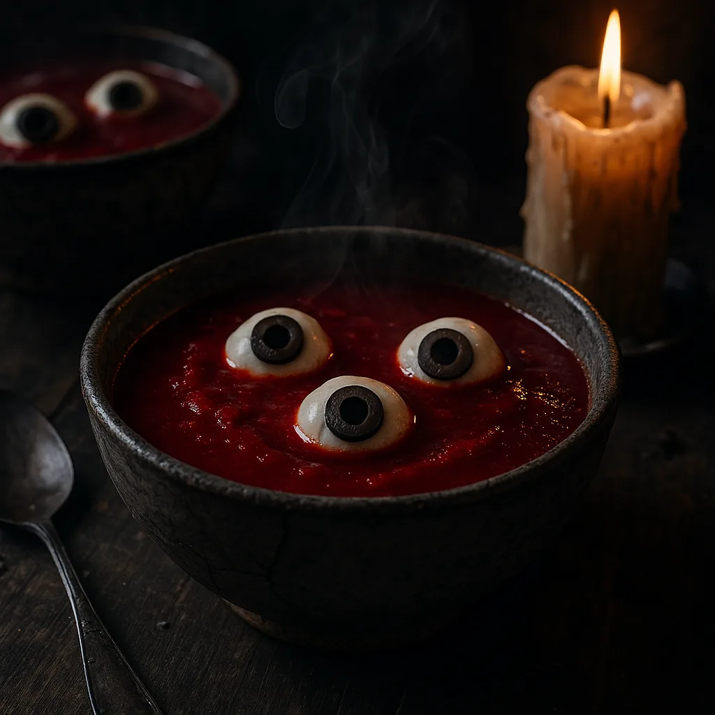 Cette soupe rouge vif, agrémentée d’yeux comestibles, est parfaite pour terrifier vos convives !
